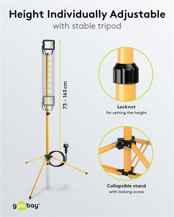 • Baulampe mit stabilem, höhenverstellbarem Metallstativ (73-163 cm), für die einfache Lagerung zusammenklappbar
