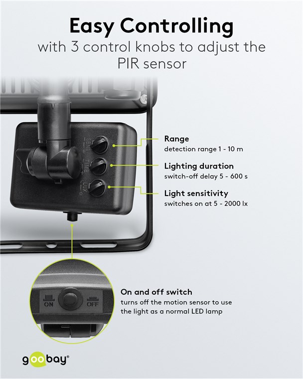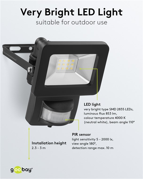 Weiterführende Links zu "Goobay 53878 LED-Außenstrahler, 10 W, mit Bewegungsmelder VPE Retail Box Mindestbestellmenge 1"