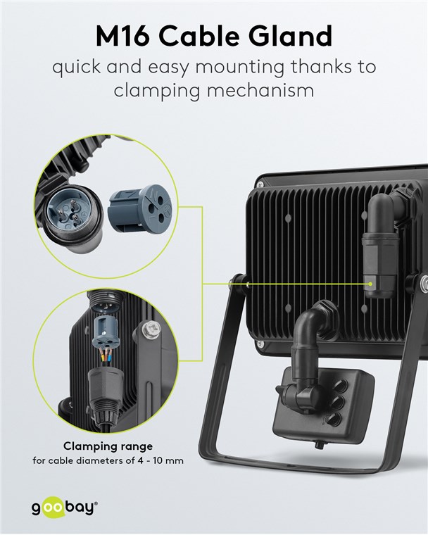 • Schnelle und einfache Montage dank praktischer M16-Kabelverschraubung mit Steckfunktion für Klemmbereich, Kabeldurchmesser 4-10 mm