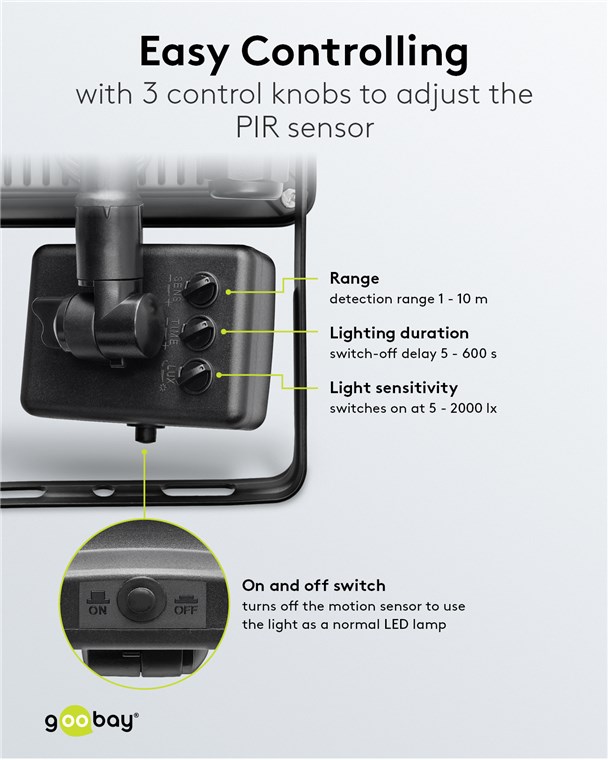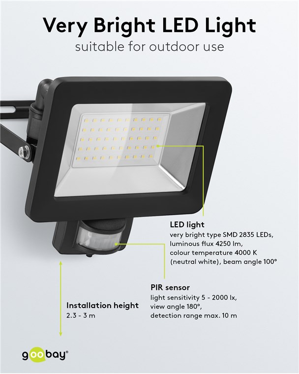 Weiterführende Links zu "Goobay 53883 LED-Außenstrahler, 50 W, mit Bewegungsmelder VPE Retail Box Mindestbestellmenge 1"