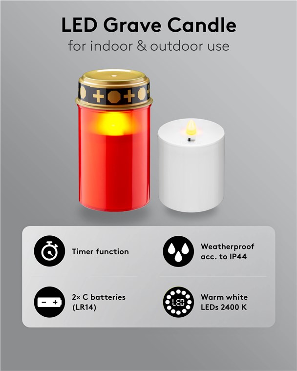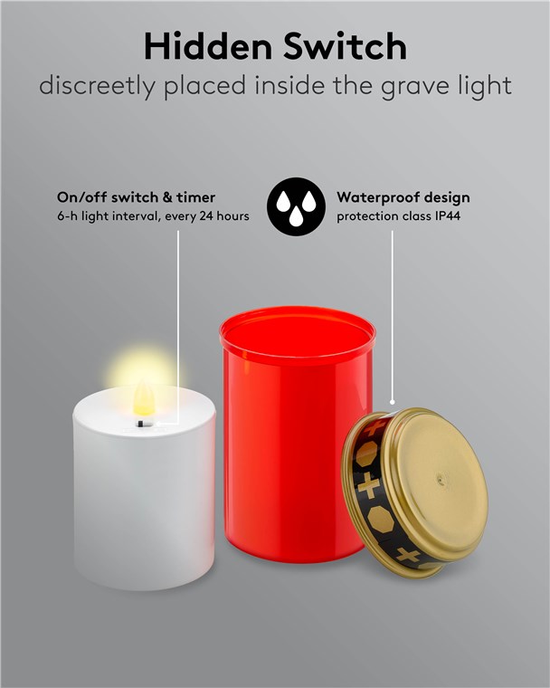 • Die Grableuchte ist für den Einsatz innen und außen geeignet - dank Schutzart IP44 und dem wasserdicht verstauten Batteriefach im Kerzeninneren