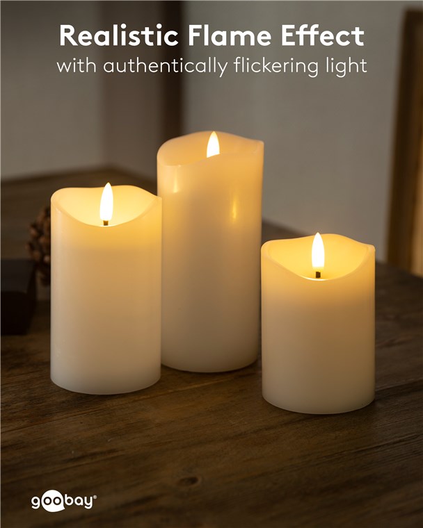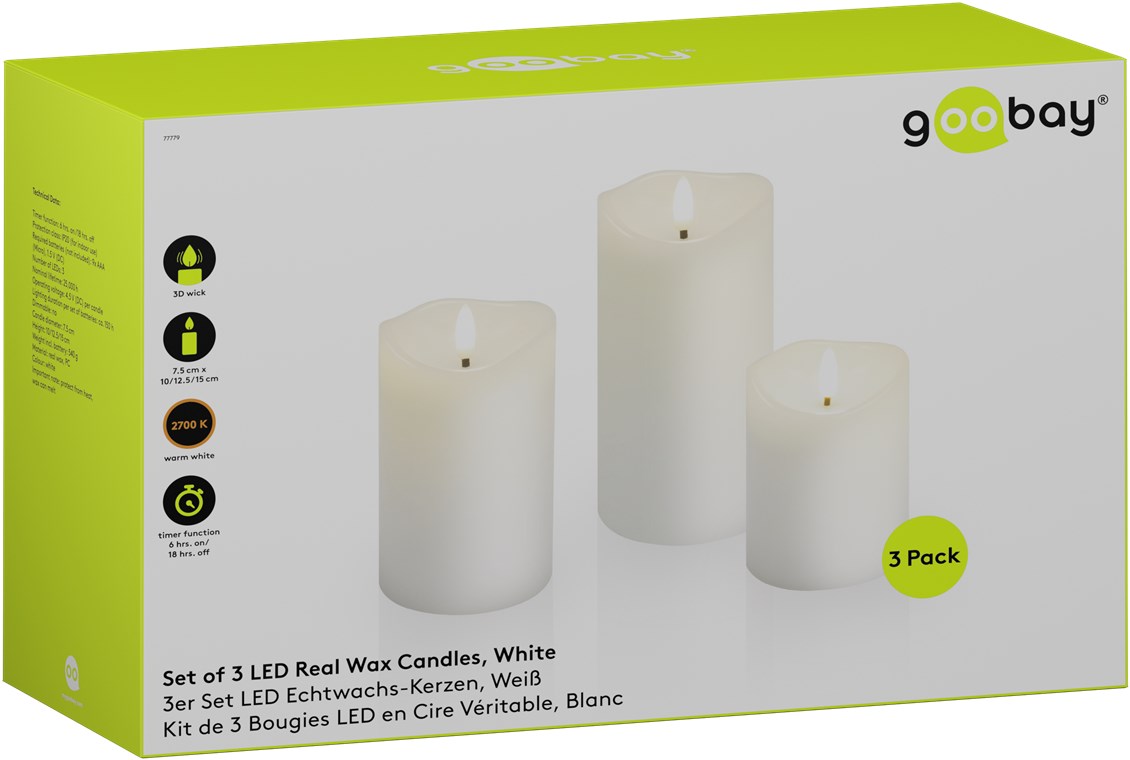 Weiterführende Links zu "Goobay 75263 3er-Set LED-Echtwachskerzen, weiß, inkl. 10x AAA (LR03) VPE Retail Polybag Mindestbestellmenge 1"