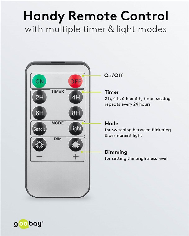 • Per Fernbedienung lassen sich die Modi Flackern oder Dauerleuchten einstellen sowie Helligkeit und Leuchtintervalle (2 h, 4 h, 6 h, 8 h, Wiederholung im 24-Stunden-Takt)
