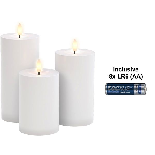 • Set bestehend aus 3 flammenlosen LED-Kerzen in unterschiedlichen Größen (7,1 x 10 / 12,5 / 15 cm) mit einer mattierten Kunststoffoberfläche und einem realistisch wirkenden, schwarzen Kerzendocht