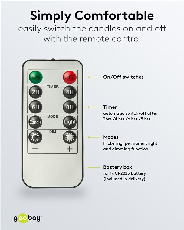 • Kerzen mit Batterie, betrieben mit je 2x AA (10 Stk./Set, im Lieferumfang enthalten), Fernbedienung: 1x CR2025 (im Lieferumfang enthalten)