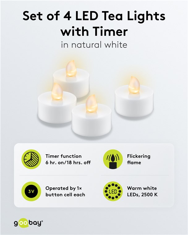 Weiterführende Links zu "Goobay 77752 4er-Set LED-Teelichter mit Timer, weiß VPE Retail Box Mindestbestellmenge 1"