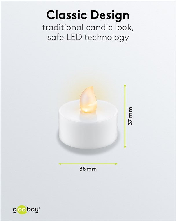 • Klassische Teelichter für warmen Kerzenschein mit natürlich flackernder Flamme – vollkommen elektrisch und vollkommen sicher
