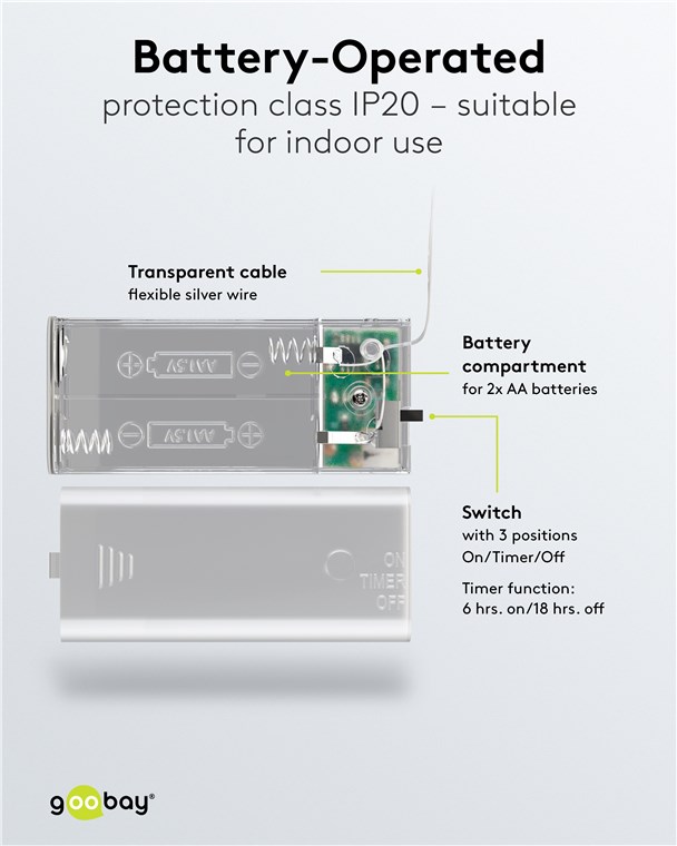 • LED-Lichterkette mit Timer-Funktion: 6 Std. an/18 Std. aus, Schalter mit 3 Positionen: On/Off/Timer