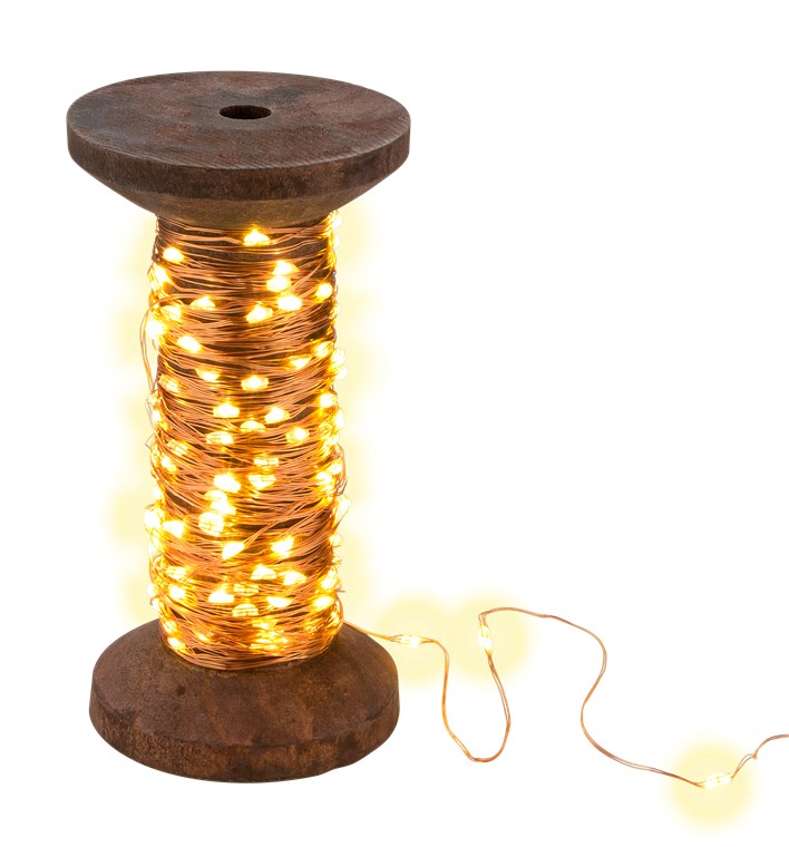 • Warmweiße Micro-LEDs schaffen eine gemütliche Atmosphäre, entweder als gebündelte Lichtquelle auf der Spule oder als Drahtlichterkette dekoriert.