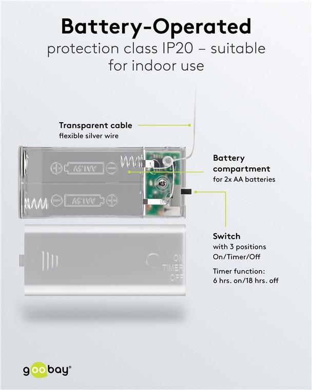 • LED-Lichterkette mit Timer-Funktion: 6 Std. an/18 Std. aus, Schalter mit 3 Positionen: On/Off/Timer