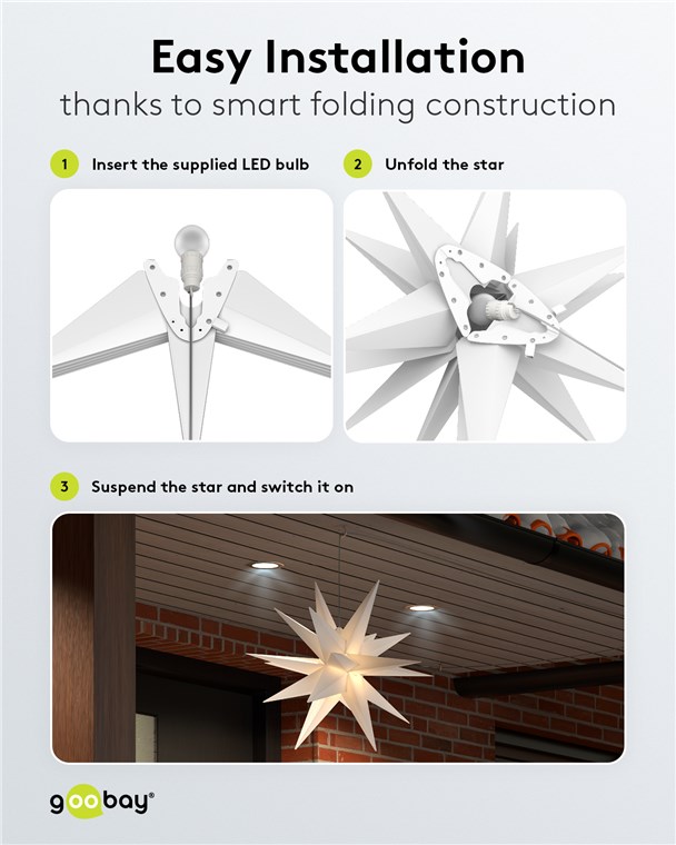 • Der Aufbau gelingt einfach und schnell dank stabiler Faltkonstruktion: mitgelieferte LED-Birne einlegen, Leuchtstern aufklappen, aufhängen, einschalten