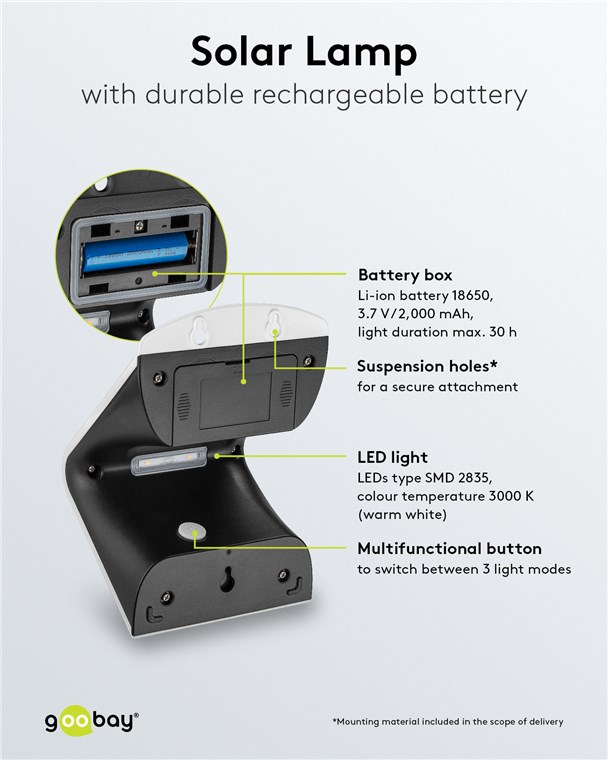 Unsere LED-Solarleuchten für den Außenbereich verursachen keine Stromkosten und sind äußerst langlebig. Hochwertige Solarpanele, stabile Gehäuse und eine einfache Montage zeichnen unsere Solar-Leuchten für Garten und Balkon aus. Goobay bringt Licht ins Dunkel. Einfach. Alles. Passend!