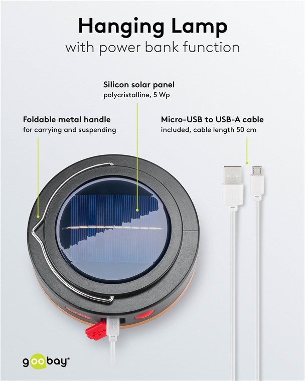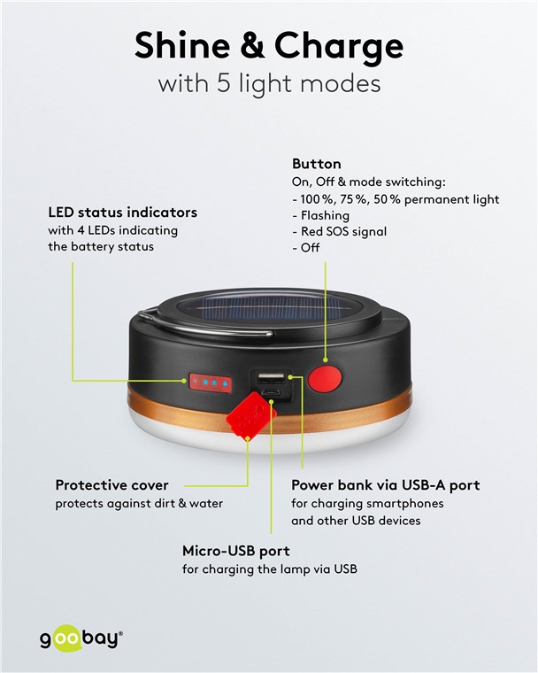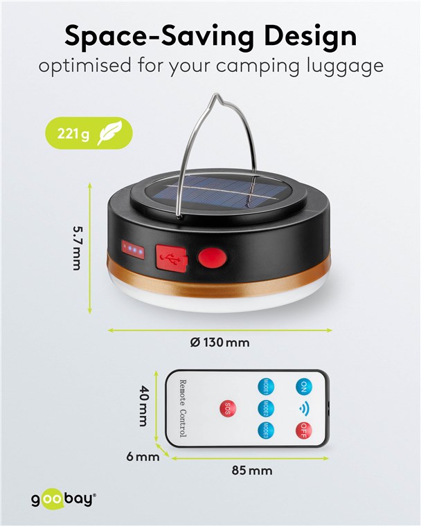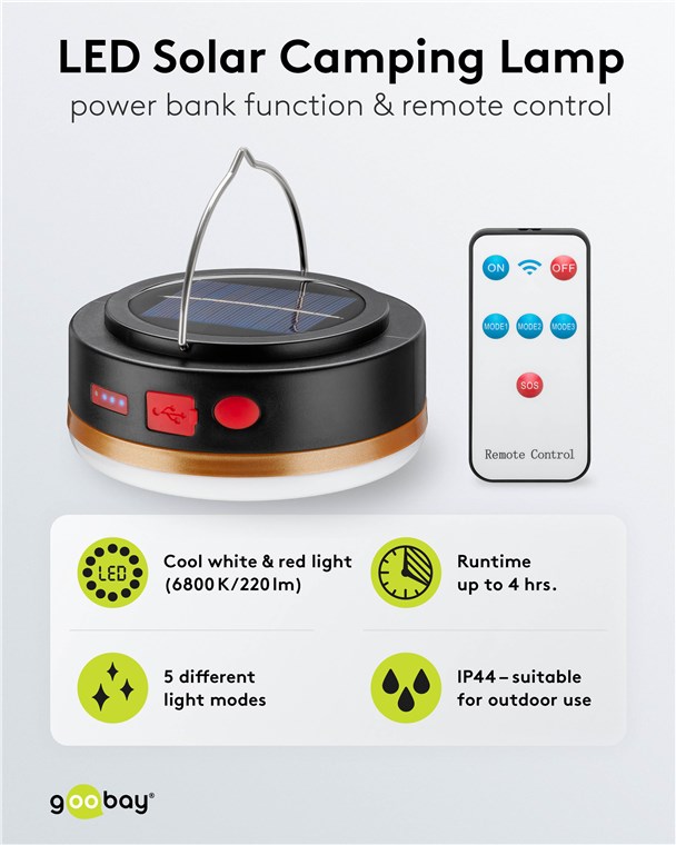 Weiterführende Links zu "Goobay 60344 LED-Solar-Campinglampe mit IR-Fernbedienung VPE Retail Box Mindestbestellmenge 1"