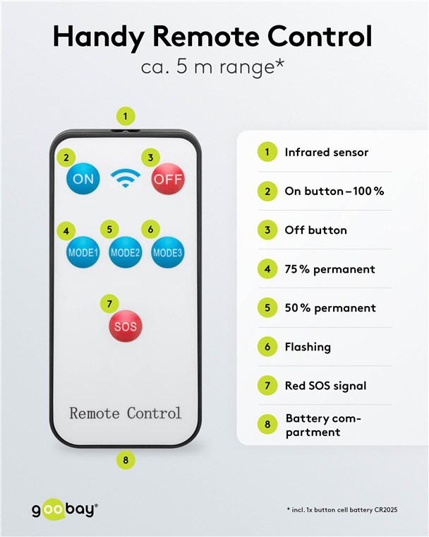 • Fernbedienung mit 6 Tasten: ON = 100 %, OFF, Mode 1 = 75 %, Mode 2 = 50 %, Mode 3 = Stroboskop, SOS (rotes Licht), Reichweite ca. 5 m, inkl. 1x Knopfzelle CR2025