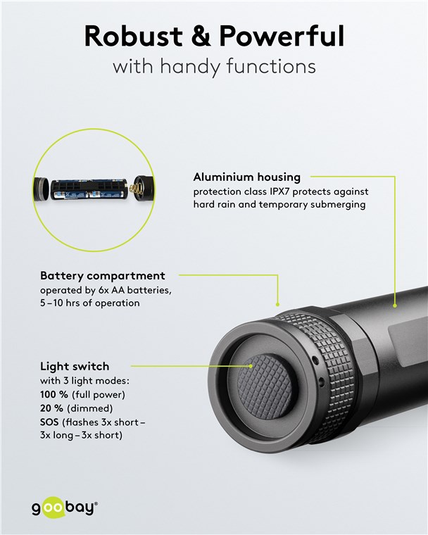 Besonders zur dunklen Jahreszeit ist eine gute Sicht bei abendlichen Spaziergängen oder Ausflügen wichtig. Durch die starke Leuchtkraft unserer Taschenlampen können weite Flächen optimal ausgeleuchtet werden. So werden Hindernisse und Stolperfallen rechtzeitig erkennbar. Das handliche, stabile Gehäuse und die lange Leuchtdauer zeichnen die Goobay-Taschenlampen aus. Einfach. Alles. Passend!