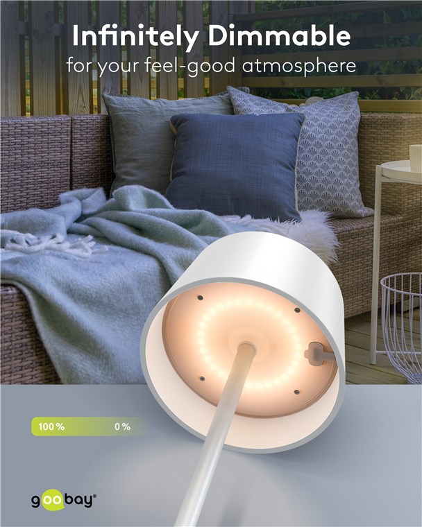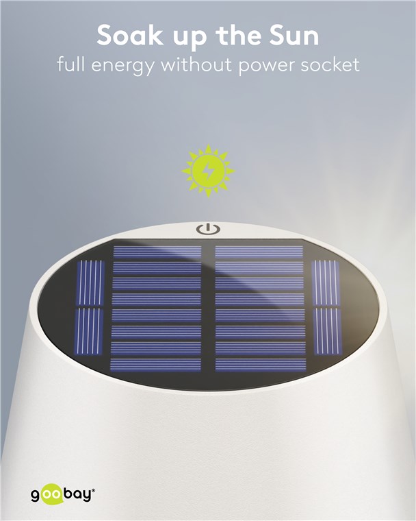 Die Tischlampe veredelt mit ihrem reduzierten, skandinavischen Design jedes Wohnzimmer, Schlafzimmer oder Esszimmer und setzt auch auf der Gartenparty ein optisches Statement. Mit der Option, umweltfreundlich über das integrierte Solarpanel zu laden, steht die Goobay-Leuchte für Nachhaltigkeit und Langlebigkeit.