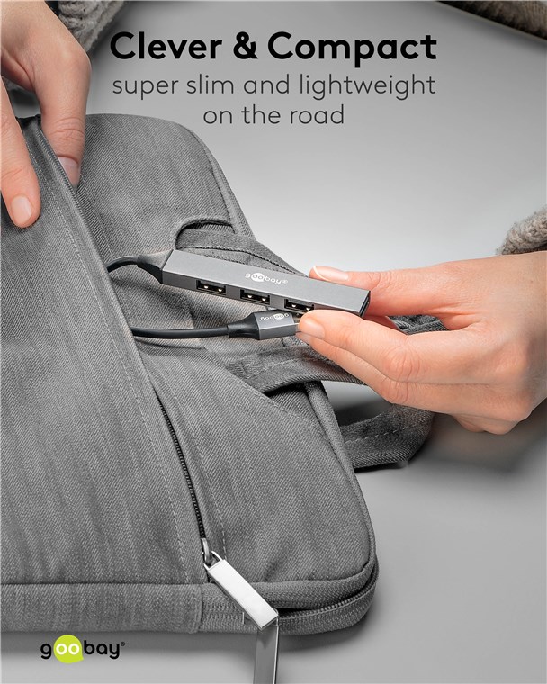 • Im extrakompakten Slim-Format passt der Hub in jede Tasche und wird unterwegs oder auf Reisen zum praktischen Begleiter