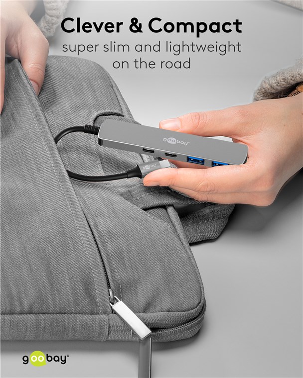 • Im kompakten Slim-Format passt der USB-C™-Hub in jede Tasche und wird unterwegs oder auf Reisen zum praktischen Begleiter