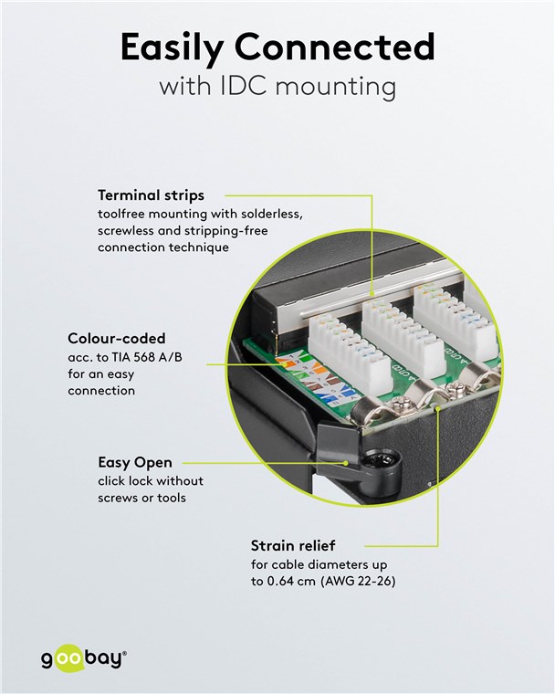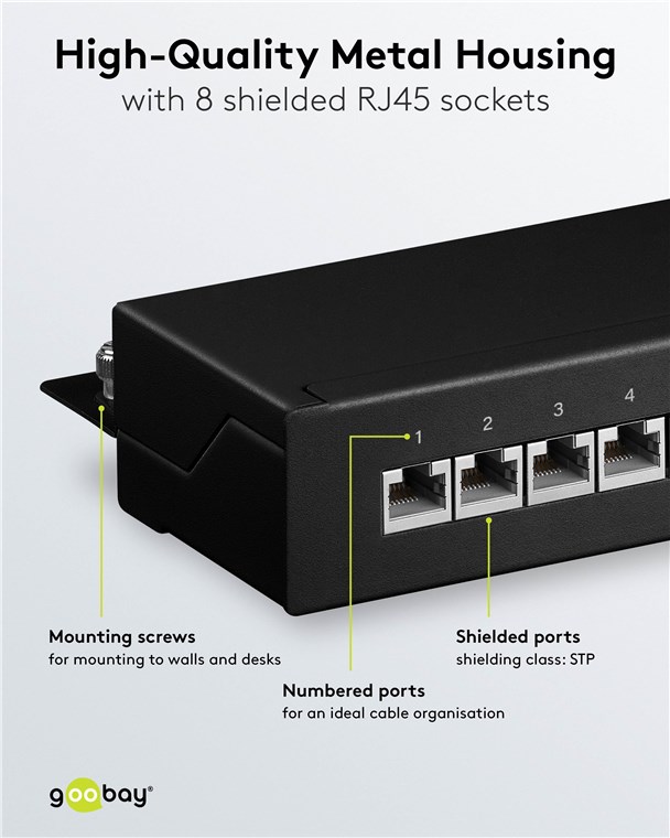 Unsere Patch-Panels besitzen ein robustes Metallgehäuse mit geschirmten Steckplätzen für eine ausgezeichnete Verbindung. Mit 8, 12 oder 24 Ports ausgestattet, können bequem alle benötigten LAN-Kabel an das Patchfeld angeschlossen werden. Goobay hat immer das richtige Produkt für Ihre Netzwerkverbindung. Einfach. Alles. Passend!