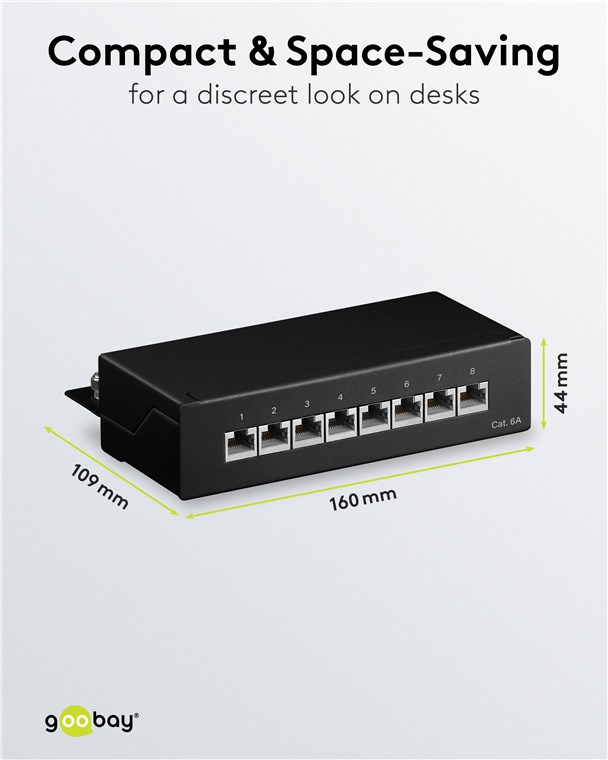 Weiterführende Links zu "Goobay 62065 CAT 6a Mini Desktop-Patchpanel, 8 Port, (1 HE) VPE Brown Box with Label Mindestbestellmenge 1"