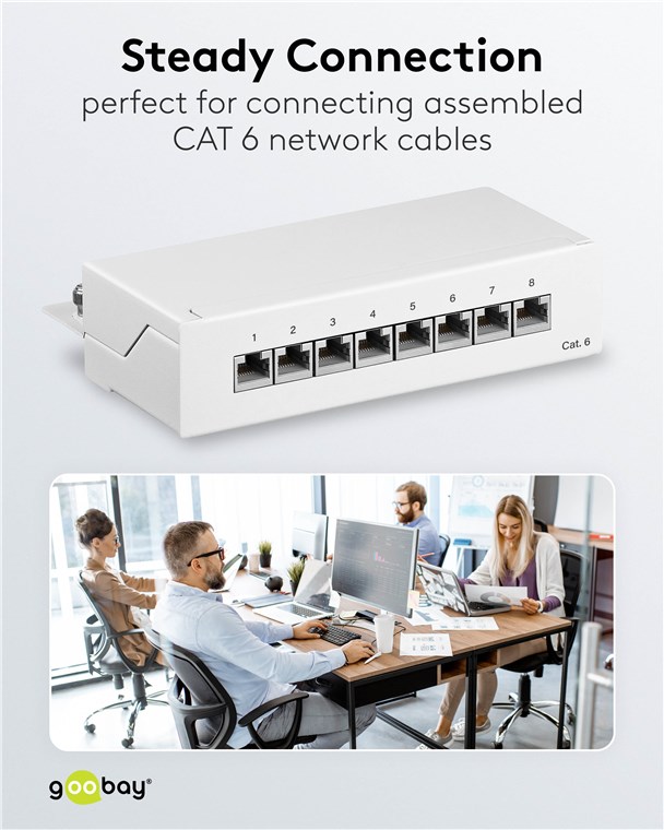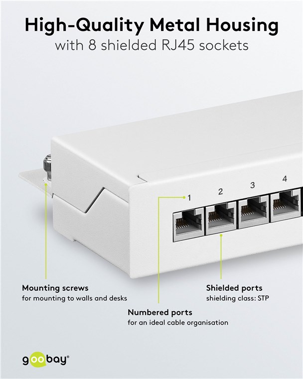 Unsere Patch-Panels besitzen ein robustes Metallgehäuse mit geschirmten Steckplätzen für eine ausgezeichnete Verbindung. Mit 8, 12 oder 24 Ports ausgestattet, können bequem alle benötigten LAN-Kabel an das Patchfeld angeschlossen werden. Goobay hat immer das richtige Produkt für Ihre Netzwerkverbindung. Einfach. Alles. Passend!