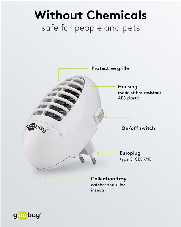 • Die Mückenlampe wird ohne Chemikalien betrieben und ist daher ungiftig und umweltfreundlich