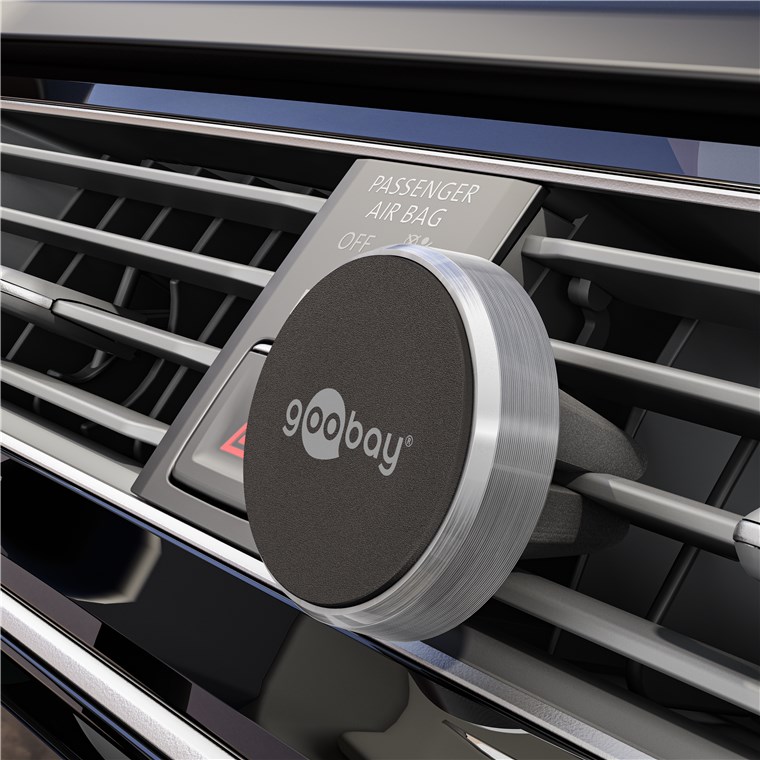 • Die Goobay Magnet-Handyhalterung fürs Auto besteht aus 1x Adapter zur Befestigung an den Lüftungsschlitzen und 2x Metallplatten für das Handy.