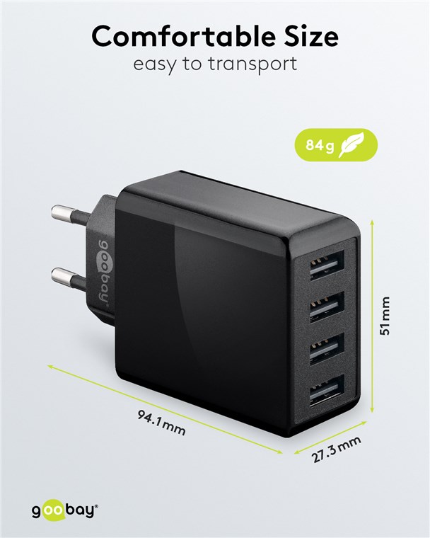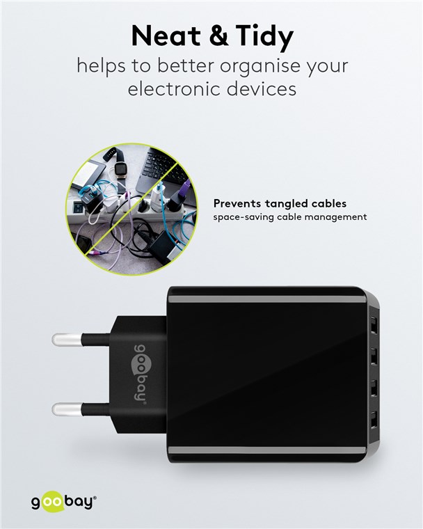 • Das Goobay-USB-Ladegerät ist mit 4x USB-A-Anschlüssen ausgestattet, um bis zu 4 Geräte gleichzeitig zu laden.