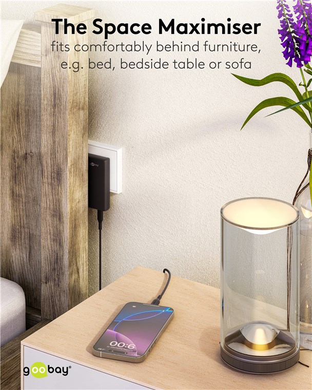 • An die Steckdose angeschlossen ist das USB-C™-Ladegerät kaum tiefer als eine Fußleiste und damit extrem platzsparend – ideal auf beengtem Raum, z. B. hinter Nachttischen und anderen Möbeln