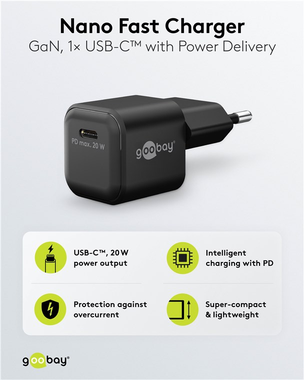 Weiterführende Links zu "Goobay 79150 USB-C™ PD GaN Schnellladegerät Nano (20 W) schwarz VPE Retail Box Mindestbestellmenge 1"