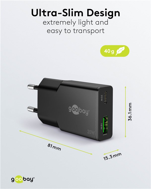 Mit der Slim-Reihe liefert Goobay ein superflaches Charger-Design ab. Speziell zugeschnitten auf die Bedürfnisse von Reisenden, passt das schlanke USB-Netzteil in jede Tasche und jedes Gepäckstück. Die perfekte Energielösung für Smartphone, Tablet oder Smartwatch, unterwegs und auf Reisen. Charge, eat, sleep, repeat!