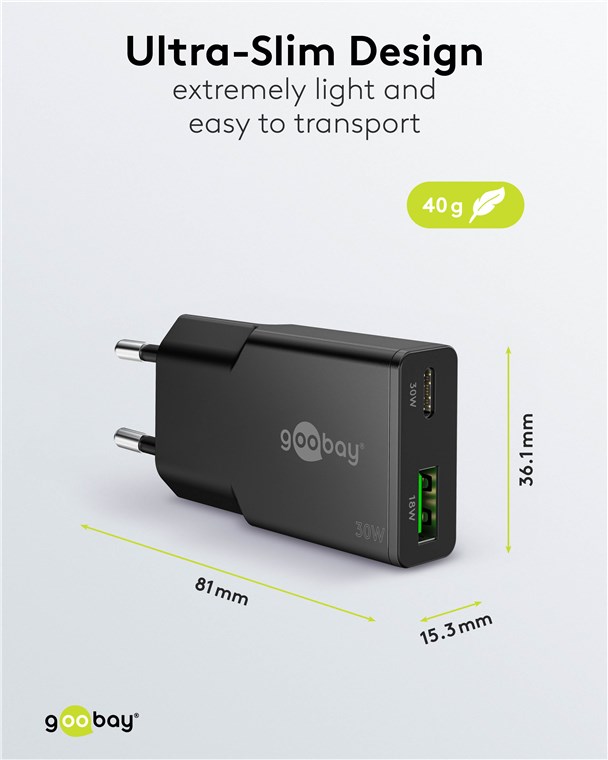 Produktinformationen "Goobay 75737 USB-C™ PD GaN Dual-Schnellladegerät Slim (30 W) schwarz VPE Retail Box Mindestbestellmenge 1"