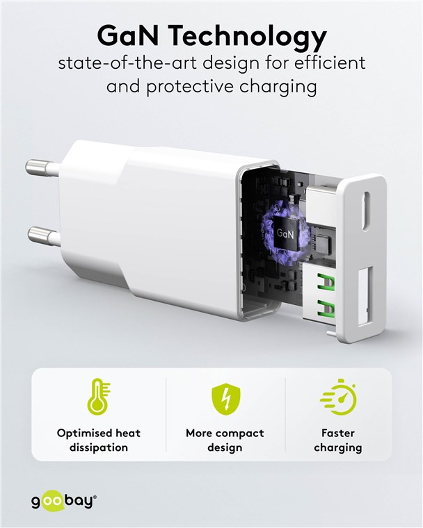 Weiterführende Links zu "Goobay 75730 USB-C™ PD GaN Dual-Schnellladegerät Slim (20 W) weiß VPE Retail Box Mindestbestellmenge 1"
