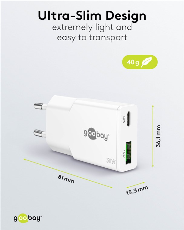 Produktinformationen "Goobay 75738 USB-C™ PD GaN Dual-Schnellladegerät Slim (30 W) weiß VPE Retail Box Mindestbestellmenge 1"