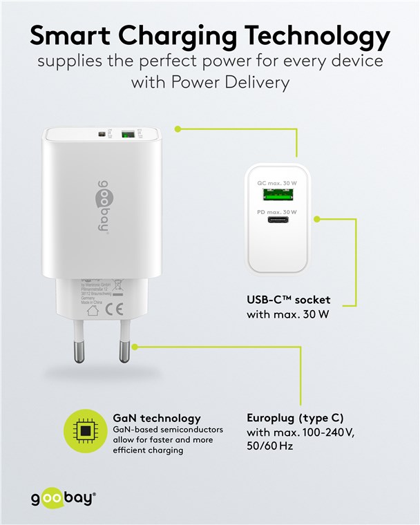 Weiterführende Links zu "Goobay 75336 USB-C™ PD GaN Dual-Schnellladegerät (30 W) weiß VPE Retail Box Mindestbestellmenge 1"