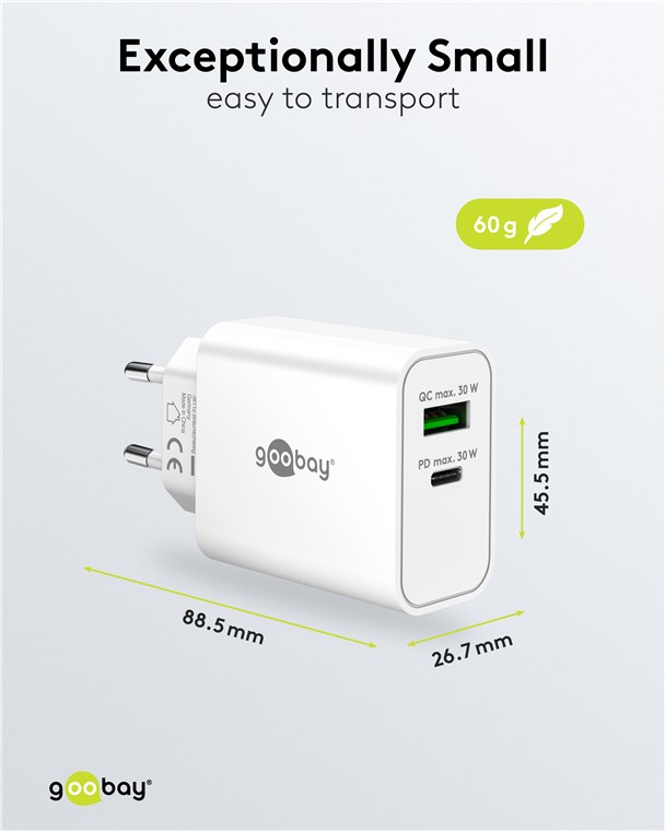 • Mit 30 W Leistung ist der Ladeadapter speziell auf kleine Geräte wie Smartphones, Bluetooth-Kopfhörer, Tablets oder E-Reader zugeschnitten
