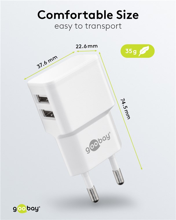• Das Goobay-Dual-USB-Ladegerät verfügt über 2x USB-A-Anschlüsse mit 12 W Leistung.