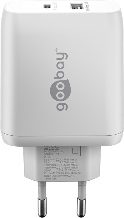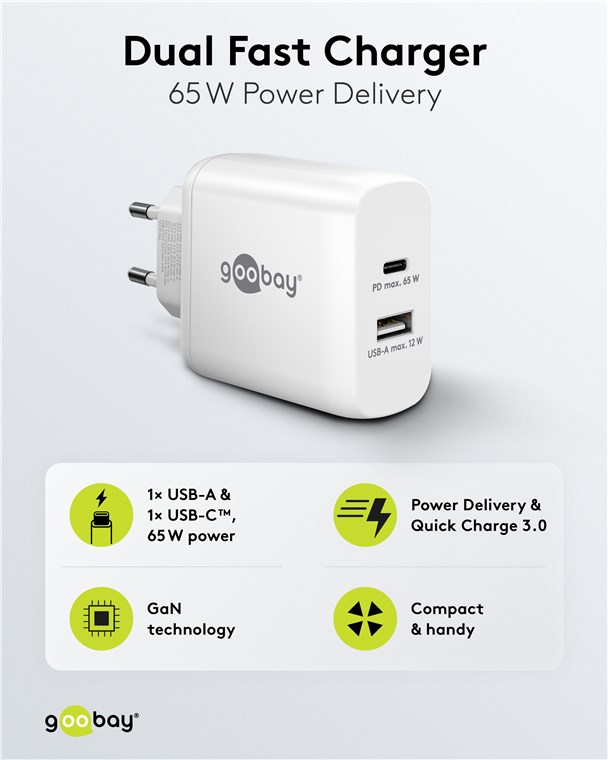 Weiterführende Links zu "Goobay 65410 USB-C™ PD GaN Dual-Schnellladegerät (65 W) weiß VPE Retail Polybag Mindestbestellmenge 1"