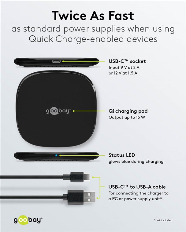 • Angeschlossen an ein Schnellladegerät (nicht enthalten) erreicht das Goobay-Induktionsladegerät per Quick Charge doppelt so hohe Ladegeschwindigkeiten wie Standard-Netzteile.