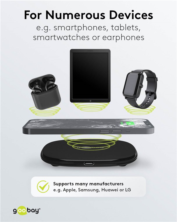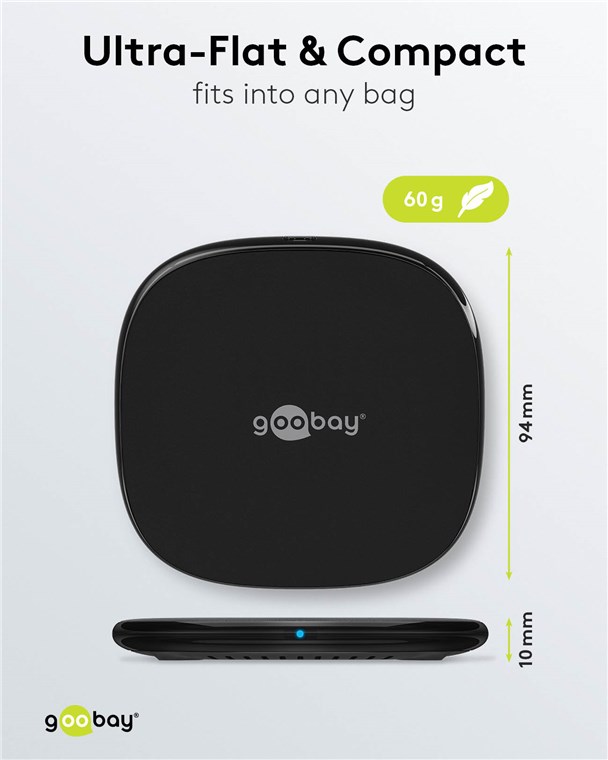 • Der Goobay-Wireless Charger ermöglicht das kabellose Laden von Geräten, die Induktionstechnologie (Qi-Standard) unterstützen.