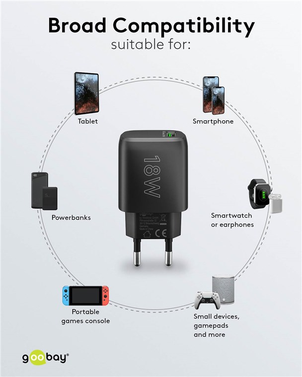 • Aufgrund des Eingangsspannungsbereichs von 100-240 V ist das Goobay-USB-C™-Netzteil auch im Ausland einsetzbar.
