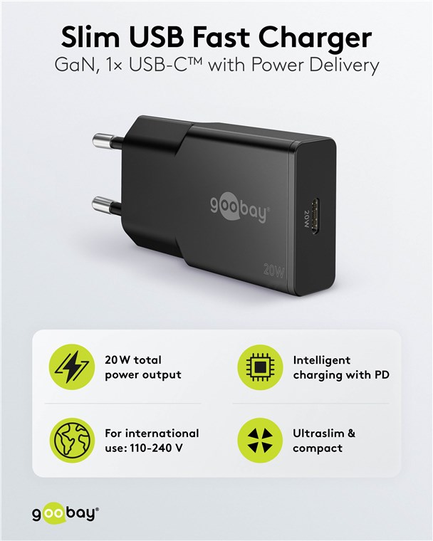 Produktinformationen "Goobay 75727 USB-C™ PD GaN Schnellladegerät Slim (20 W) schwarz VPE Retail Box Mindestbestellmenge 1"