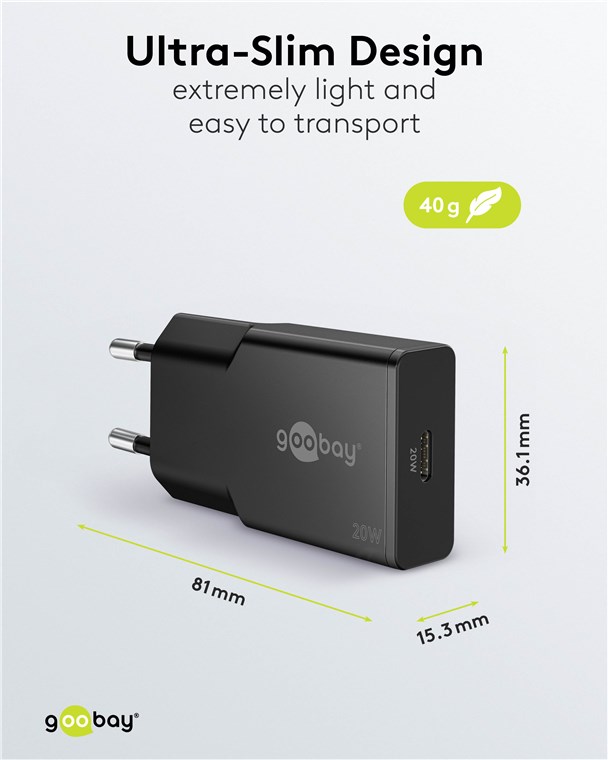 Mit der Slim-Reihe liefert Goobay ein superflaches Charger-Design ab. Speziell zugeschnitten auf die Bedürfnisse von Reisenden, passt das schlanke USB-Netzteil in jede Tasche und jedes Gepäckstück. Die perfekte Energielösung für Smartphone, Tablet oder Smartwatch, unterwegs und auf Reisen. Charge, eat, sleep, repeat!