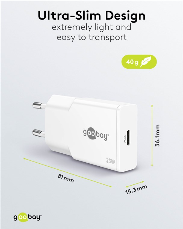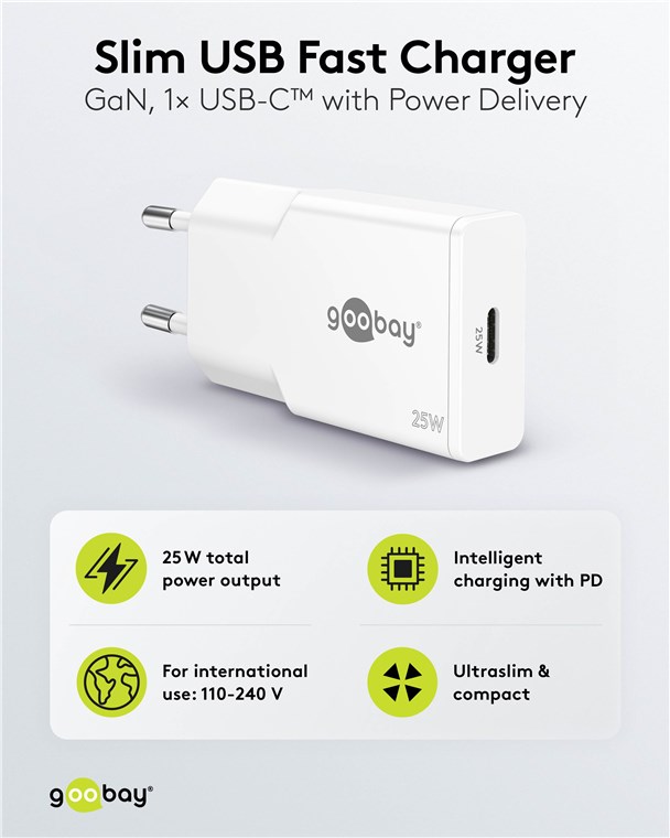 Weiterführende Links zu "Goobay 75732 USB-C™ PD GaN Schnellladegerät Slim (25 W) weiß VPE Retail Box Mindestbestellmenge 1"