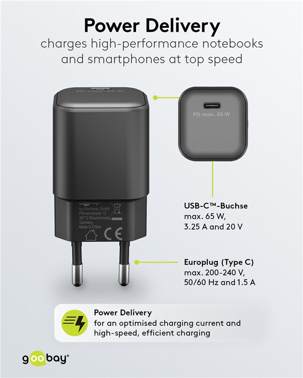 • Mit der starken Leistung von 65 W und dem universellen USB-C™-Anschluss ist das Goobay-Netzteil für so gut wie jedes Gerät geeignet - vom Smartphone bis hin zum Hochleistungs-Notebook