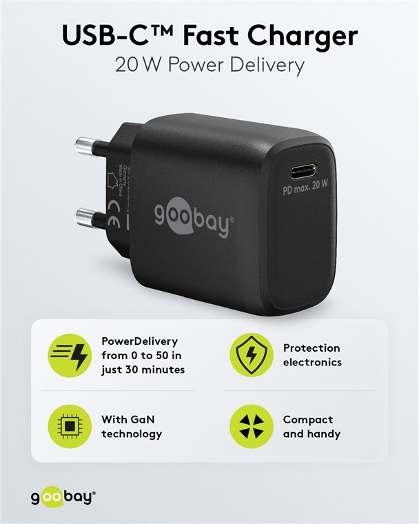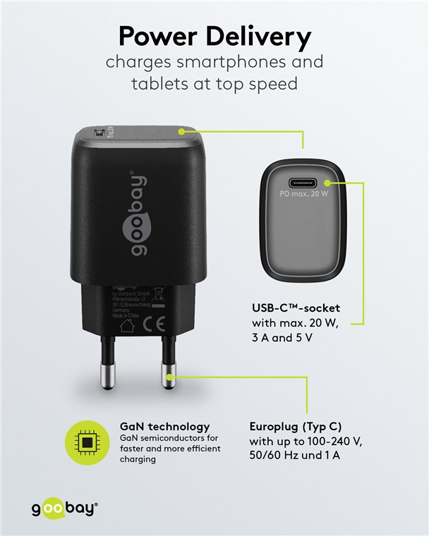 Weiterführende Links zu "Goobay 65405 USB-C™ PD GaN Schnellladegerät (20 W) schwarz VPE Retail Polybag Mindestbestellmenge 1"