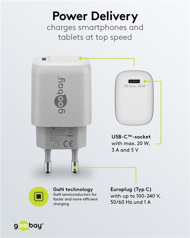 Weiterführende Links zu "Goobay 65406 USB-C™ PD GaN Schnellladegerät (20 W) weiß VPE Retail Polybag Mindestbestellmenge 1"