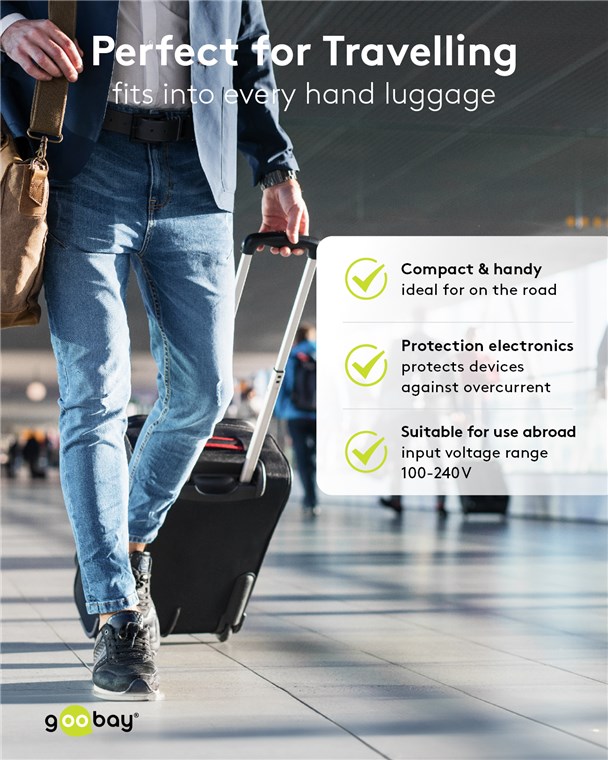 • Aufgrund des Eingangsspannungsbereichs von 100-240 V ist das Goobay-USB-Netzteil auch im Ausland einsetzbar.
