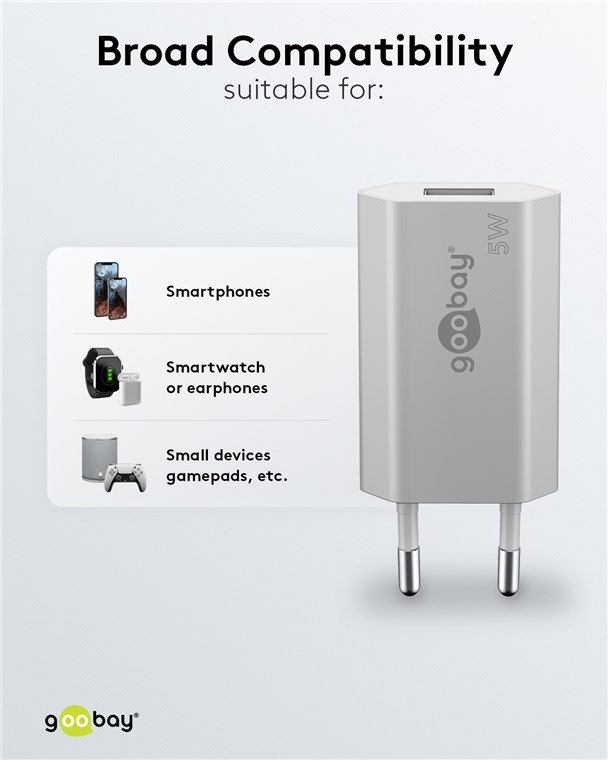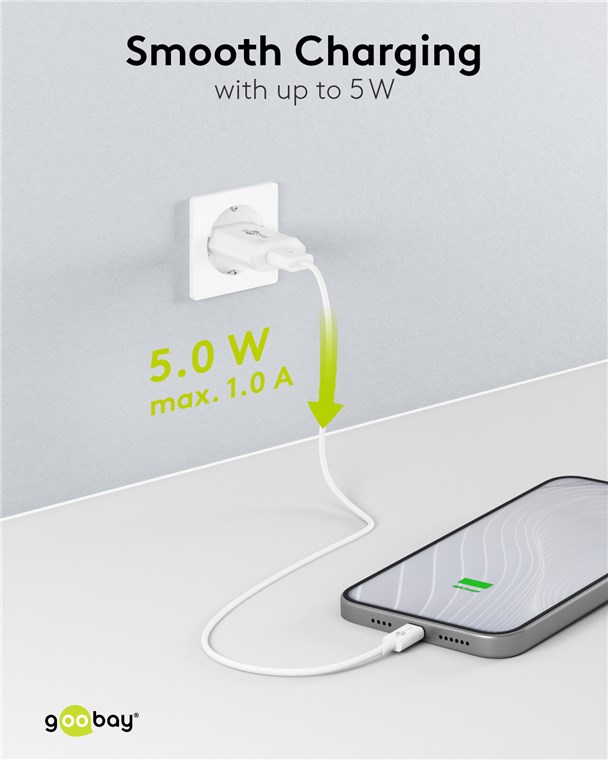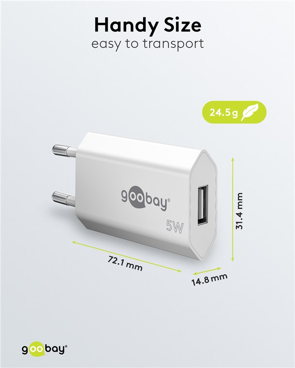 • Das Goobay-USB-Ladegerät verfügt über 1x USB-A-Anschluss mit 5 W Leistung.