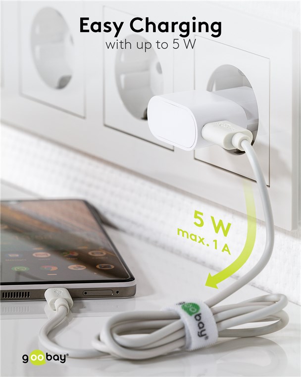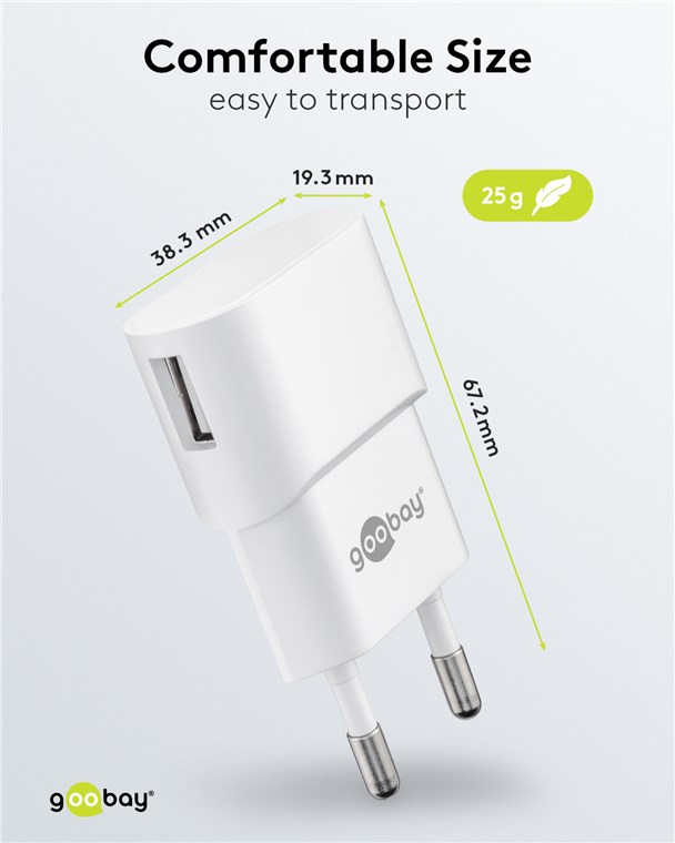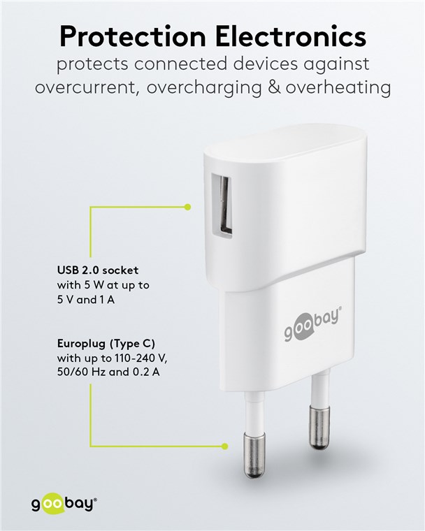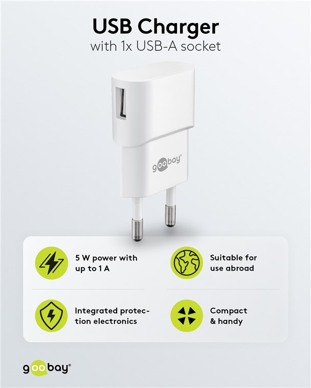 • Das Goobay-USB-Ladegerät verfügt über 1x USB-A-Anschluss mit 5 W Leistung.